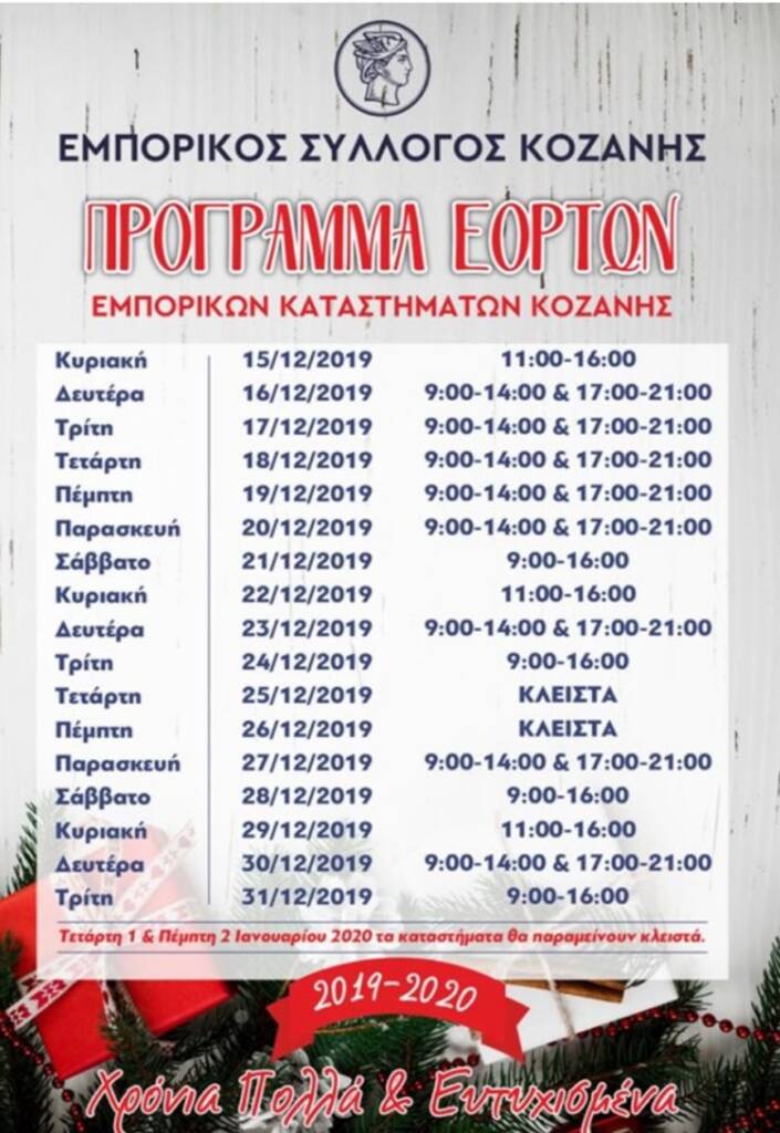 Από την Κυριακή 15 Δεκεμβρίου θα ξεκινήσει η εφαρμογή του εορταστικού ωραρίου του Εμπορικού Συλλόγου Κοζάνης, το οποίο θα ισχύει μέχρι και την Τρίτη 31 Δεκεμβρίου. Για τις ημέρες αυτές τα καταστήματα της Κοζάνης ανοιχτά με διευρυμένο ωράριο, προκειμένου να εξυπηρετήσουν καλύτερα το αγοραστικό κοινό για τις αγορές τους ενόψει των Χριστουγέννων και της Πρωτοχρονιάς. Σύμφωνα με το εορταστικό ωράριο, τα καταστήματα θα είναι ανοιχτά την Κυριακή 15 Δεκεμβρίου από τις 11 μέχρι και τις 4 το απόγευμα, καθώς και την Κυριακή 22 Δεκεμβρίου, όπως και την Κυριακή 29 Δεκεμβρίου. Τις καθημερινές, τα καταστήματα θα είναι ανοιχτά από τις 9 το πρωί μέχρι τις 2 το μεσημέρι και από τις 5 το απόγευμα μέχρι και τις 9 το βράδυ. Τα Σάββατα τα καταστήματα θα είναι ανοιχτά από τις 9 το πρωί μέχρι και τις 4 το απόγευμα. 1 και 2 Ιανουαρίου τα καταστήματα θα είναι κλειστά.