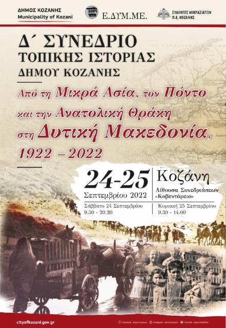 Ο Δήμος Κοζάνης σε συνεργασία με την Εταιρεία Δυτικομακεδονικών Μελετών και τον Σύλλογο Μικρασιατών Π.Ε. Κοζάνης διοργανώνουν το Δ΄ Συνέδριο Τοπικής Ιστορίας Δήμου Κοζάνης με θέμα «Από τη Μικρά Ασία, τον Πόντο και την Ανατολική Θράκη στη Δυτική Μακεδονία, 1922 – 2022», στις 24 – 25 Σεπτεμβρίου 2022.