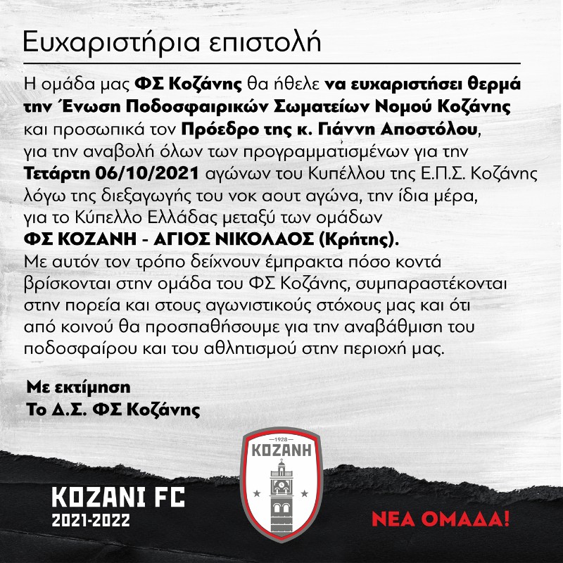 Η ομάδα μας ΦΣ Κοζάνης θα ήθελε να ευχαριστήσει θερμά την Ένωση Ποδοσφαιρικών Σωματείων Νομού Κοζάνης και προσωπικά τον Πρόεδρο της κ. Γιάννη Αποστόλου, για την αναβολή όλων των προγραμματισμένων για την Τετάρτη 06/10/2021 αγώνων του Κυπέλλου της Ε.Π.Σ. Κοζάνης λόγω της διεξαγωγής του νοκ αουτ αγώνα, την ίδια μέρα, για το Κύπελλο Ελλάδας μεταξύ των ομάδων ΦΣ ΚΟΖΑΝΗ – ΑΓΙΟΣ ΝΙΚΟΛΑΟΣ (Κρήτη). Με αυτόν τον τρόπο δείχνουν έμπρακτα πόσο κοντά βρίσκονται στην ομάδα του ΦΣ Κοζάνης, συμπαραστέκονται στην πορεία και στους αγωνιστικούς στόχους μας και ότι από κοινού θα προσπαθήσουμε για την αναβάθμιση του ποδοσφαίρου και του αθλητισμού στην περιοχή μας.