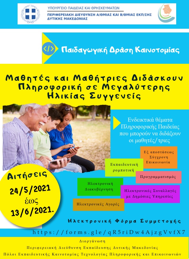 Η Περιφερειακή Διεύθυνση Εκπαίδευσης Δυτικής Μακεδονίας αξιοποιώντας τους Πόλους Εκπαιδευτικής Καινοτομίας Τεχνολογίας Πληροφορικής και Επικοινωνιών (Π.Ε.Κ.Τ.Π.Ε.), διοργανώνει παιδαγωγική δράση καινοτομίας με θέμα: