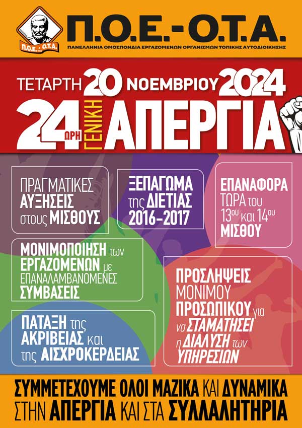 Η Πανελλήνια Ομοσπονδία Εργαζομένων Οργανισμών Τοπικής Αυτοδιοίκησης (Π.Ο.Ε.-Ο.Τ.Α.) καλεί τους εργαζόμενους στην Τοπική Αυτοδιοίκηση να συμμετάσχουν μαζικά, ενωτικά και δυναμικά στην 24ωρη Γενική Απεργία που θα πραγματοποιηθεί την ΤΕΤΑΡΤΗ 20 ΝΟΕΜΒΡΙΟΥ 2024, καθώς επίσης στην κεντρική Απεργιακή Συγκέντρωση Διαμαρτυρίας που θα γίνει στην Πλατεία Κλαυθμώνος, στις 11:00 το πρωί της ίδια ημέρας, όπως και στις Συγκεντρώσεις οι οποίες θα διεξαχθούν και σε άλλες πόλεις της Ελλάδας.
