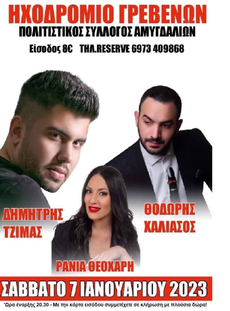 Μετά την τεράστια επιτυχία που είχε το γλέντι στη γιορτή Κερασιού, ο Πολιτιστικός Σύλλογος Αμυγδαλιών ξαναφέρνει σε εμάς αγαπημένους καλλιτέχνες για μια μοναδική βραδιά, ώστε να γιορτάσουμε όλοι μαζί το νέο έτος.