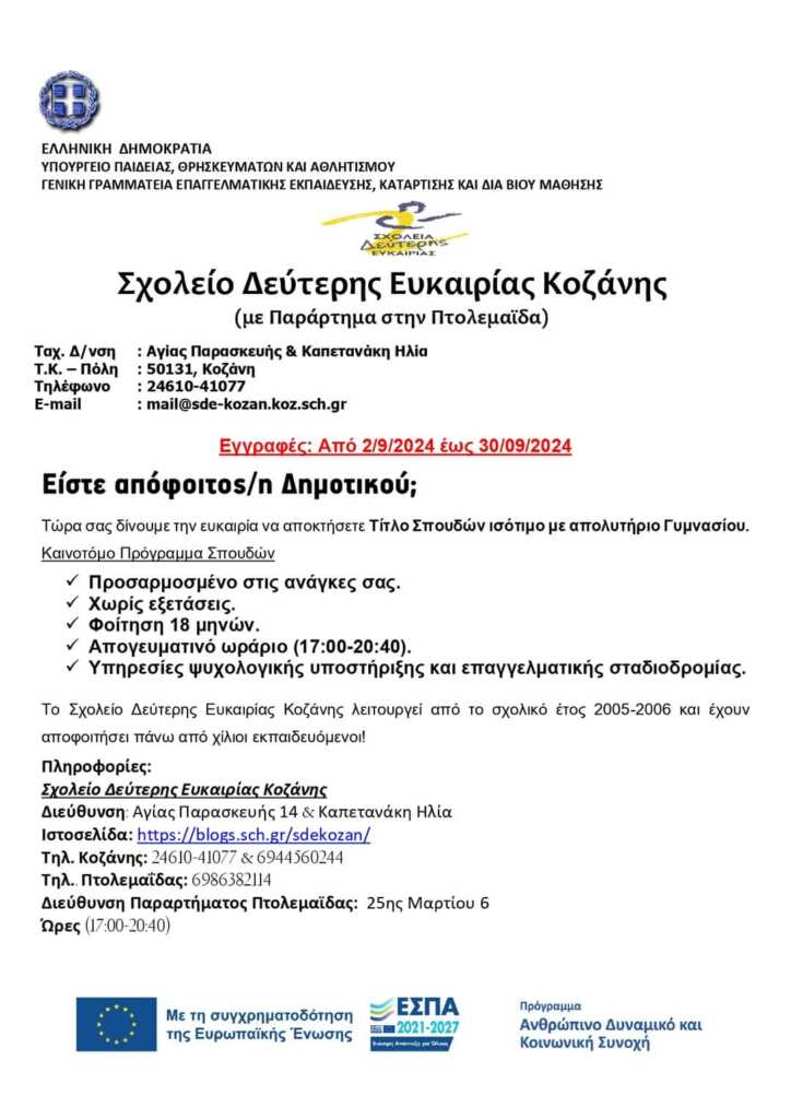 Σε εξέλιξη οι εγγραφές στο Σχολείο Δεύτερης Ευκαιρίας Κοζάνης