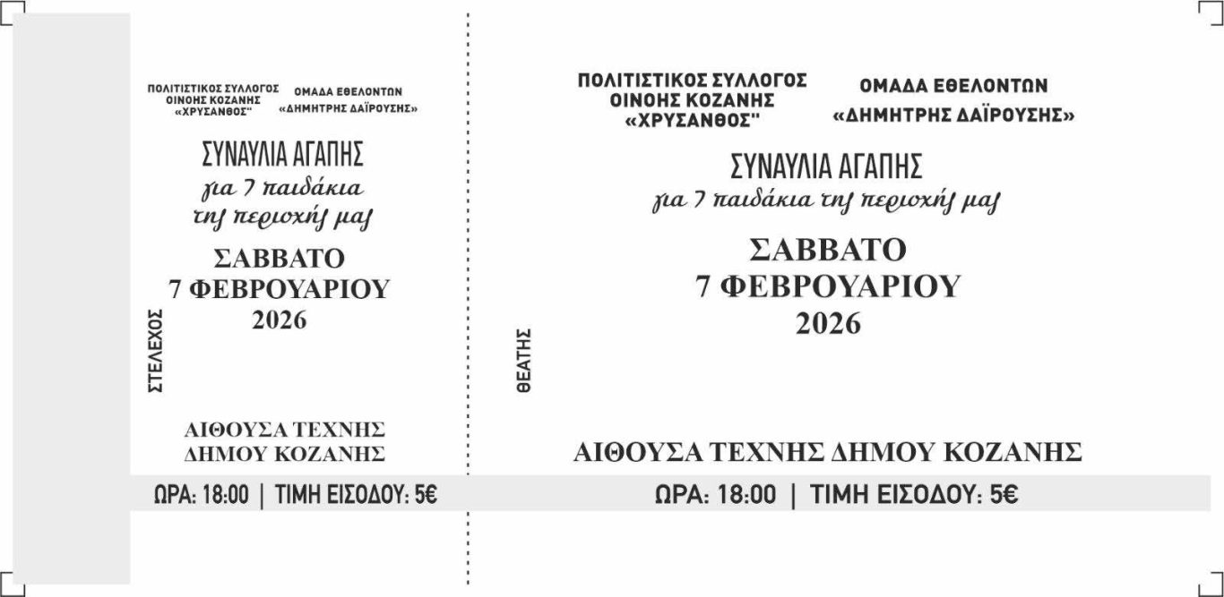 Η εκδήλωση θα πραγματοποιηθεί το Σάββατο 7 Φεβρουαρίου 2026 στην Αίθουσα Τέχνης του Δήμου Κοζάνης και όλα τα έσοδα θα διατεθούν σε επτά (7) παιδιά με πολύ σοβαρά προβλήματα υγείας. Η τιμή του εισιτηρίου είναι πέντε (5) €.