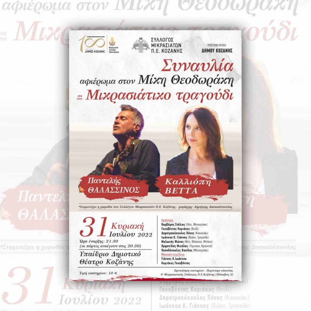 Χωρίς κατηγορίαΣυναυλία με τον Παντελή Θαλασσινό και την Καλλιόπη Βέτα, διοργανώνει ο Μικρασιατικός Σύλλογος Π.Ε. Κοζάνης και ο Δήμος Κοζάνης την Κυριακή 31/7 από kouzounews28 Ιουλίου 20220