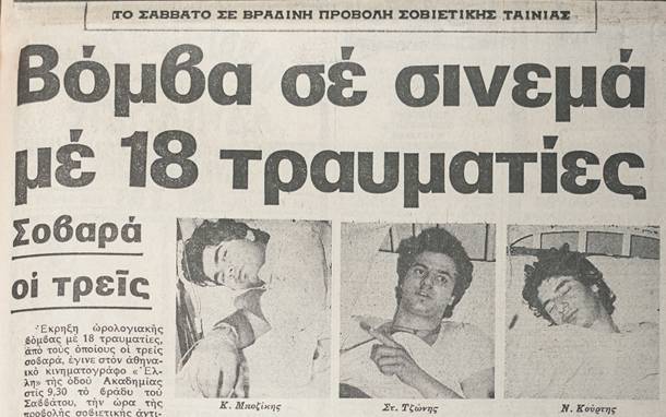 1978 Βόμβα εκρήγνυται στον κινηματογράφο «Έλλη» της οδού Ακαδημίας, κατά τη διάρκεια της προβολής της σοβιετικής ταινίας «Ουράνιο Τόξο» του σκηνοθέτη Μαρκ Ντονσκόι. 18 θεατές τραυματίζονται, απ’ τους οποίους οι τρεις πολύ σοβαρά. Η τρομοκρατική πράξη αποδίδεται στην ακροδεξιά.